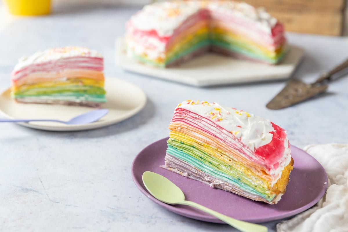 Pour le montage, commencez par placer une crêpe violette sur un plat de service. Étalez une couche de crème sur le dessus, puis déposez une autre crêpe par-dessus. Alternez les crêpes en respectant l'ordre des couleurs (violet, bleu, vert, jaune, orange, rouge). Terminez avec une généreuse couche de chantilly et saupoudrez de vermicelles multicolores. Réfrigérez le tout jusqu’au moment de servir.