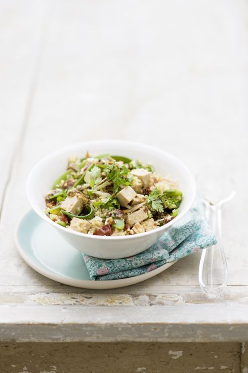 5. Dans un grand récipient, combinez le boulgour avec les pois mange-tout, tomates séchées, cerfeuil, tofu et amandes, tout en intégrant la vinaigrette.