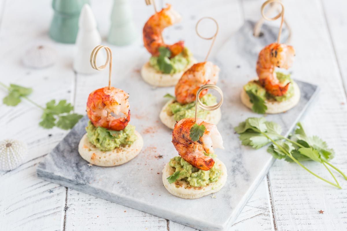 Offrez à vos invités un apéritif festif et plein de saveurs avec ces bouchées raffinées de crevettes et guacamole sur des blinis faits maison. La combinaison subtile d'épices et d'exotis fera le bonheur de tous.