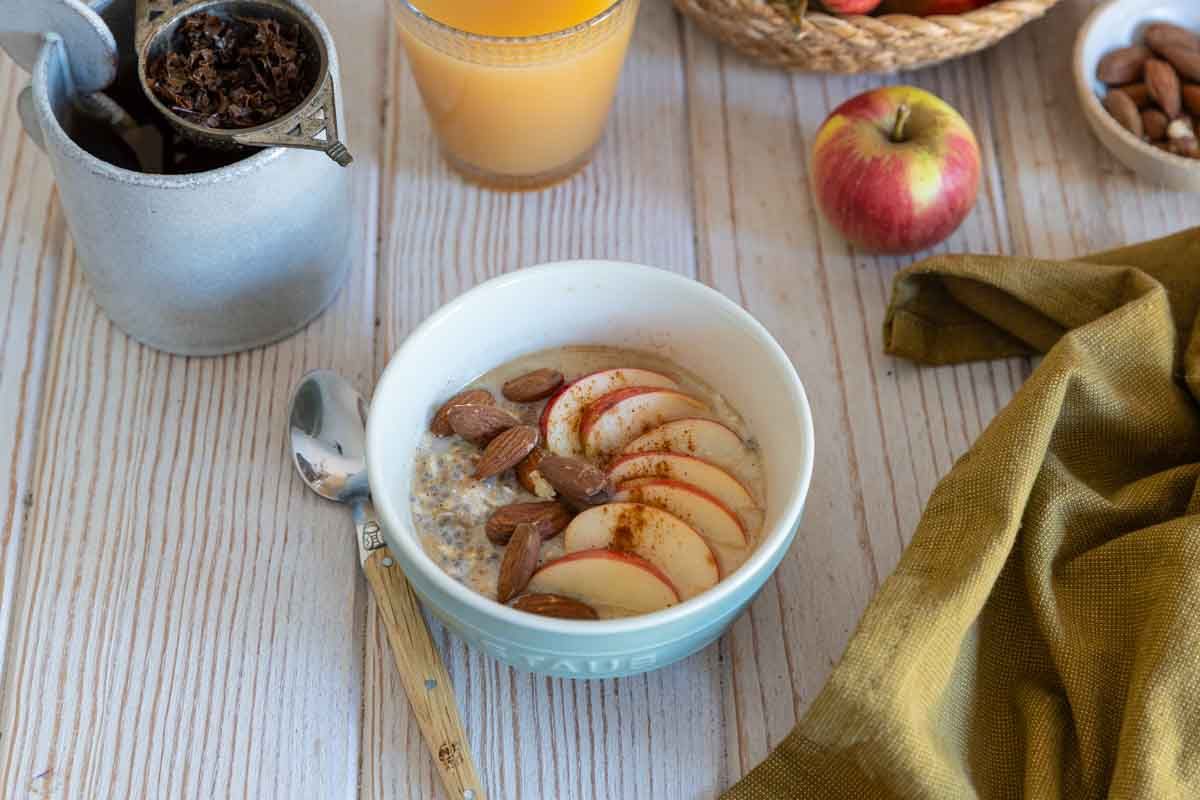 - Version automne : Lait d’avoine, cannelle, pomme râpée, purée de noisettes, amandes.