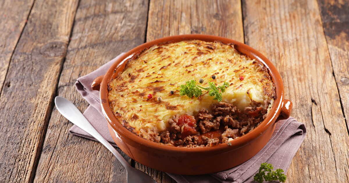 Pelez 300 g de pommes de terre et 300 g de navets, faites-les cuire dans de l'eau bouillante. Écrasez-les ensuite. Dans une poêle, faites revenir 1 oignon dans un peu d'huile d'olive, ajoutez 400 g de viande hachée avec 20 cl de bouillon de bœuf, assaisonnez et laissez mijoter. Dans un plat graissé, alternez des couches de viande et de purée, puis saupoudrez 30 g de chapelure et 100 g de gruyère avant d'enfourner 25 minutes à 200 °C.