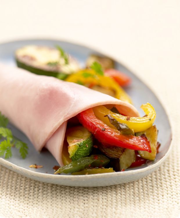 - Placez les légumes grillés au centre de chaque tranche de jambon, puis enroulez délicatement.