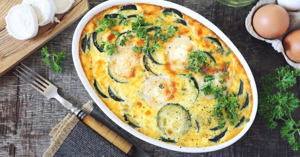 - Assemblez les ingrédients : dans un plat, disposez les courgettes et le fromage. Dans un bol, battez les œufs, ajoutez le lait, salez et poivrez, puis versez le mélange sur les légumes.