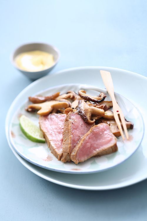 Il ne vous reste plus qu'à trancher le veau en biais, en découpant des morceaux d’environ 1,5 cm d’épaisseur. Disposez cinq tranches sur chaque assiette, ajoutez les shiitakes, assaisonnez d’un tour de moulin à poivre, d’un filet d’huile d’olive et de quelques gouttes de sauce soja.