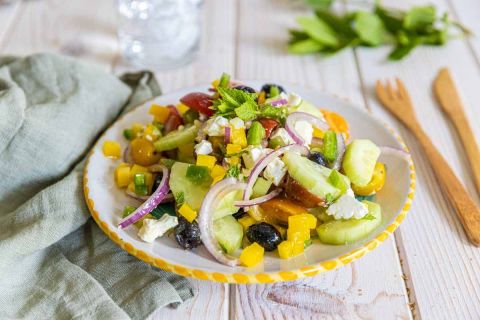 Cette présentation colorée de légumes et d'herbes aromatiques n’est pas seulement un régal pour les yeux. Les tomates cerise, le concombre, les poivrons et les olives s’allient à la feta pour créer une explosion de goûts. Accompagnée d'une vinaigrette maison, cette salade devient le plat idéal pour un repas léger ou un pique-nique.