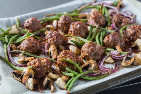 - Ajoutez des légumes comme des champignons, de l'oignon rouge et des haricots verts autour des boulettes, puis arrosez d'un filet d'huile d'olive. Cuisez au four pendant environ 20 à 25 minutes.